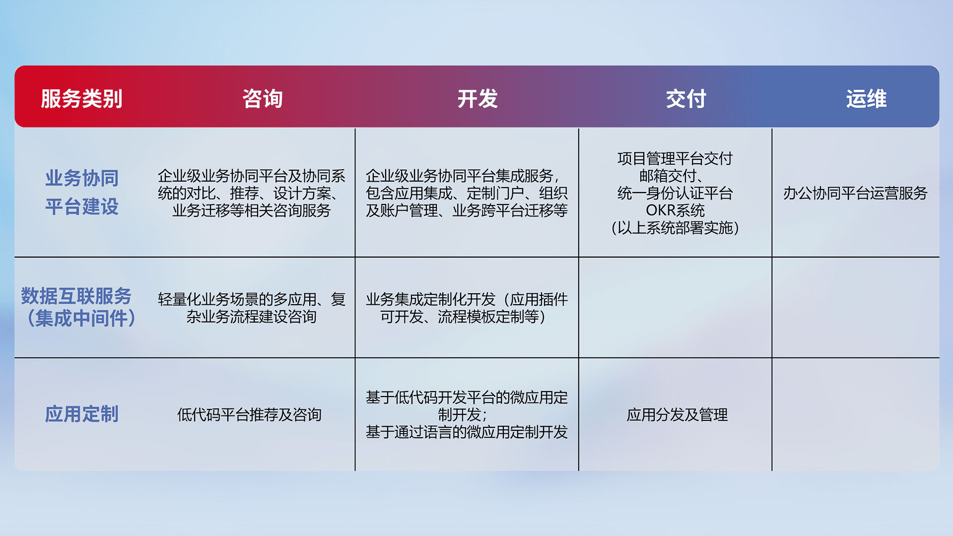 针对钉钉、、、、企微、、、IDaas等平台级产品提供产品的规划、、、方案、、、、交付、、、定制化开发等服务,,实现如统一协同办公、、智能客户服务、、、混合会议管理、、智能数据查询、、、、等业务场景,,,,实现数字化转型。。。